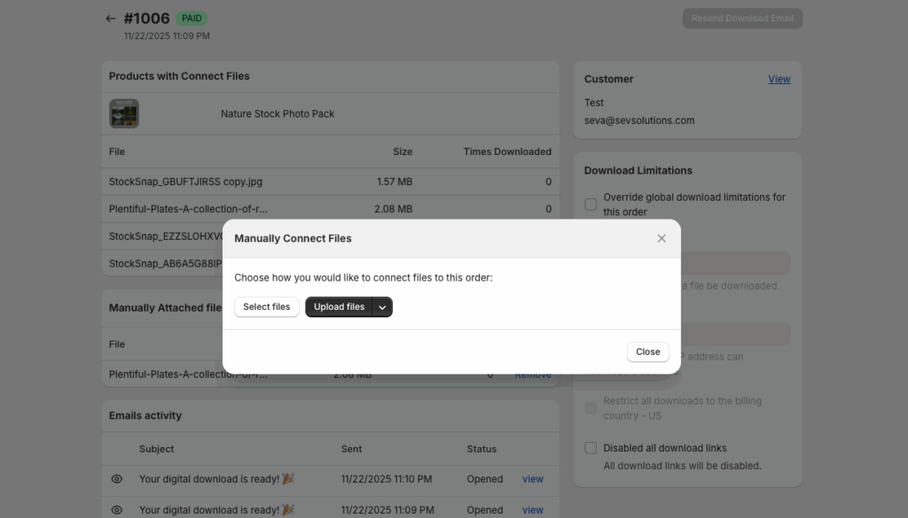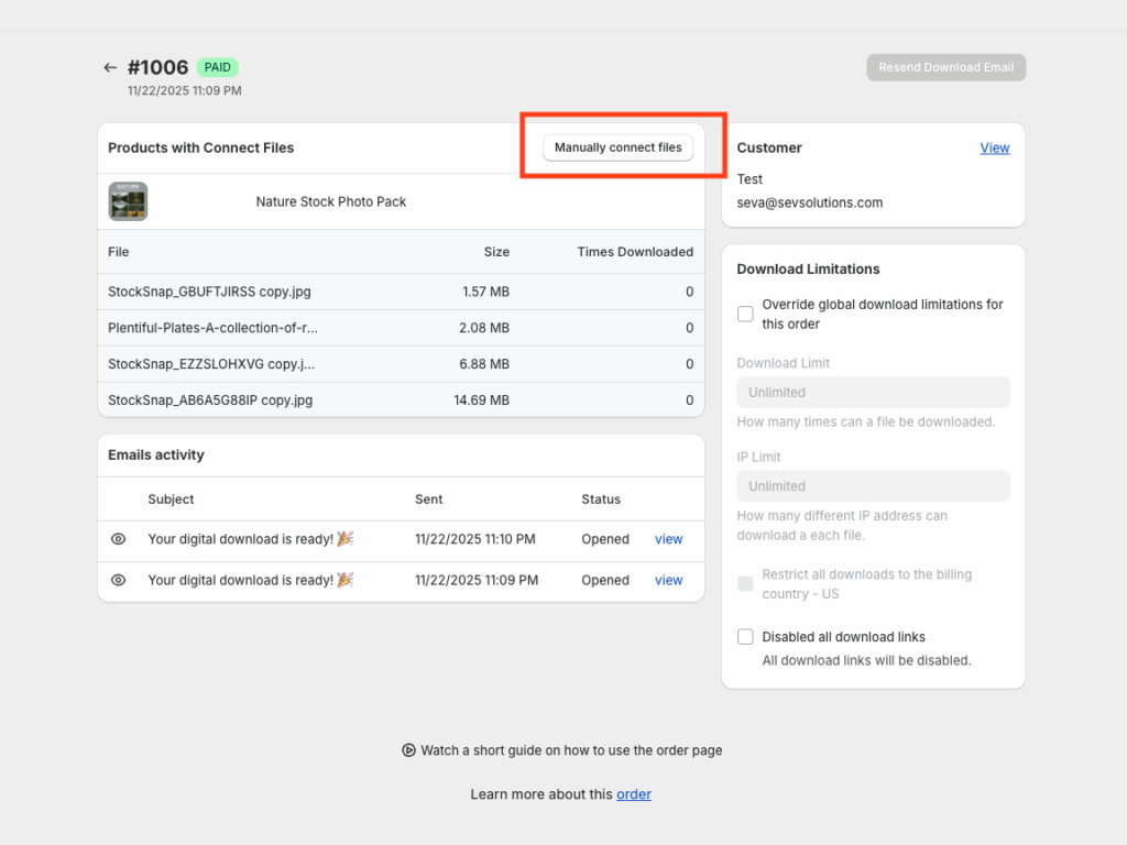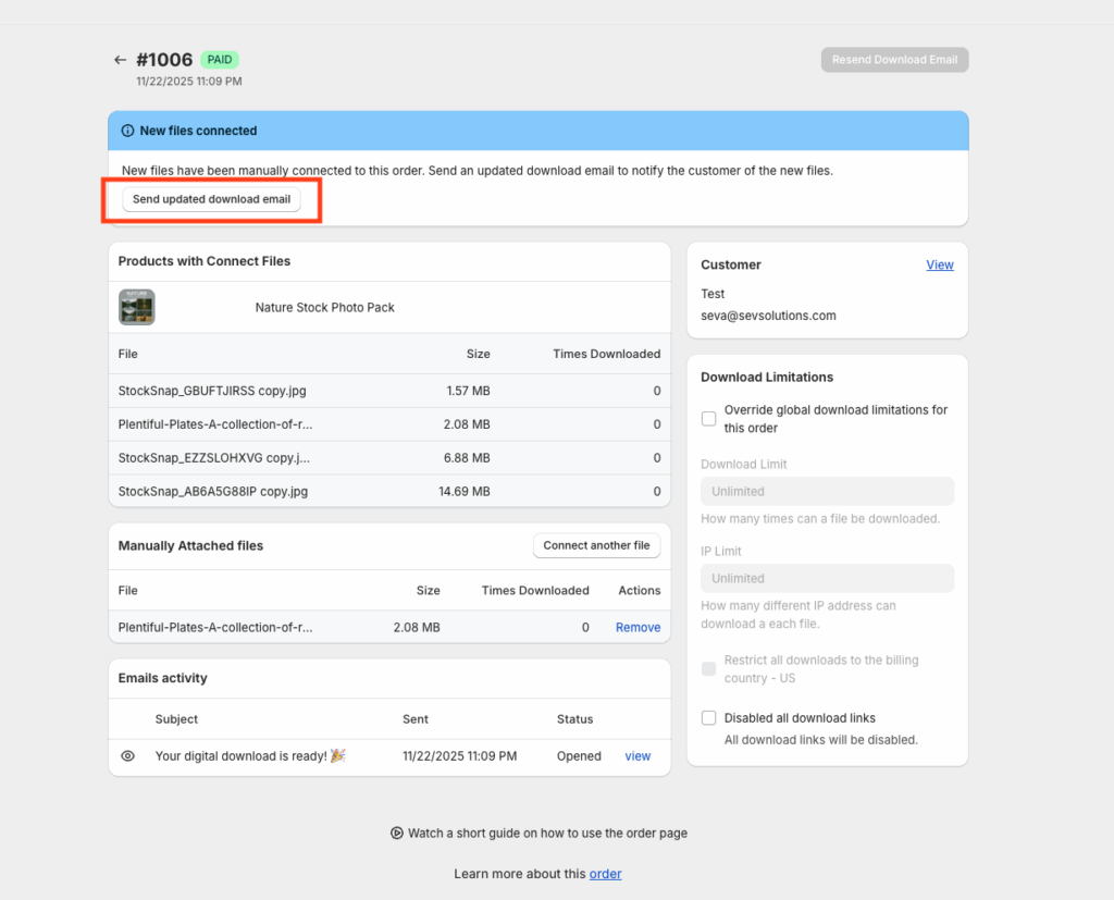 ProductName_v2.pdforProductName_2025-11-22.zip), so the customer knows it’s the latest version. - Email content: Customize your email template for “New file(s) added to order” messages to clearly explain what changed (e.g., “Hi Jane — we’ve enhanced your file for better quality. Please click below to download the new version.”). For more information on this, click here.