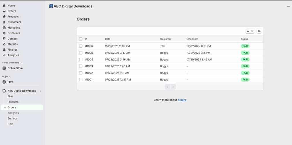 - In your Shopify Admin, go to Apps → ABC Digital Downloads → Orders